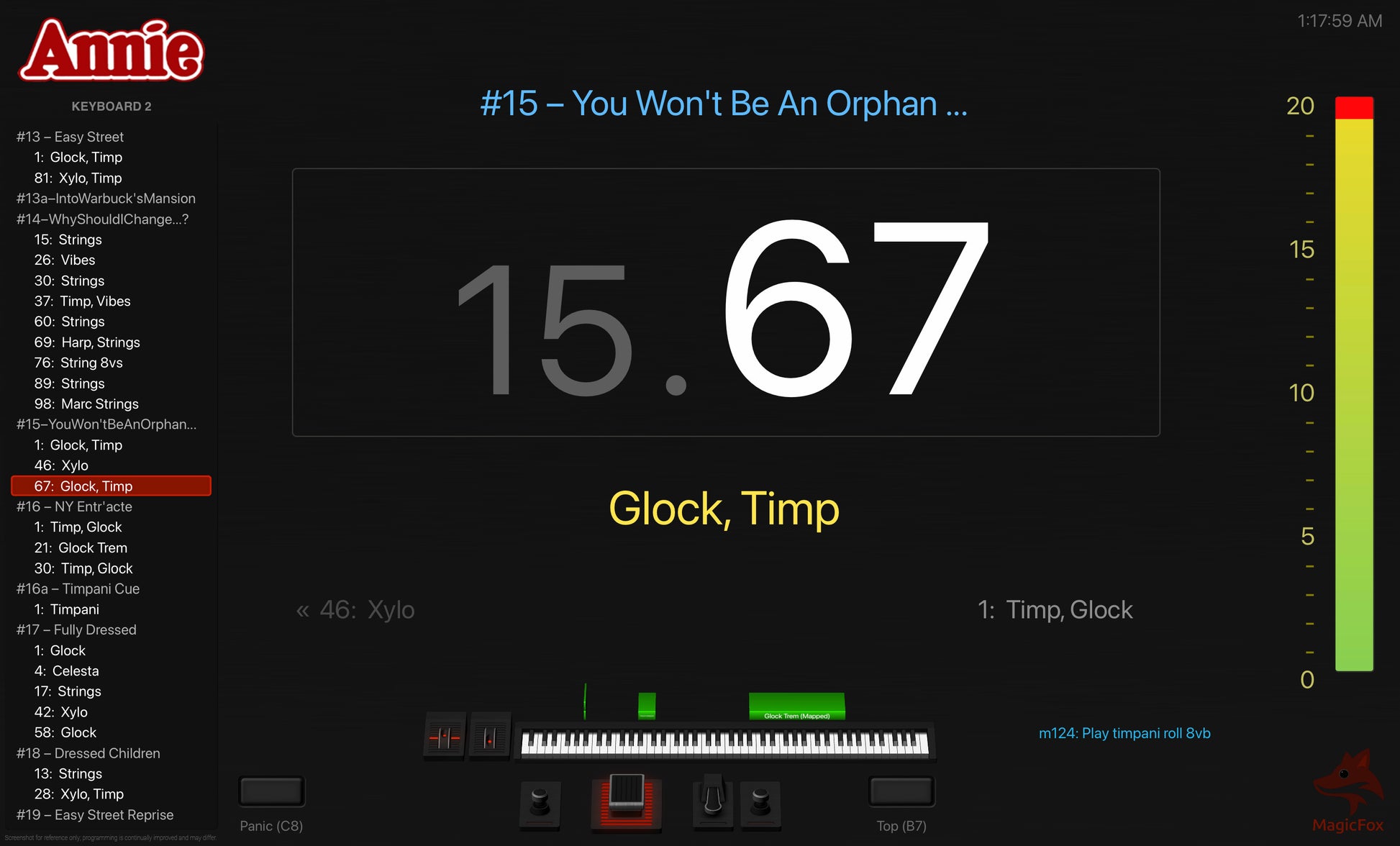 MagicFox does not provide programming for the Keyboard 1 (Piano/Conductor) book for Annie because it is intended to be played on acoustic piano. For your convenience, we have added optional celesta patches that may be played by Keyboard 2.